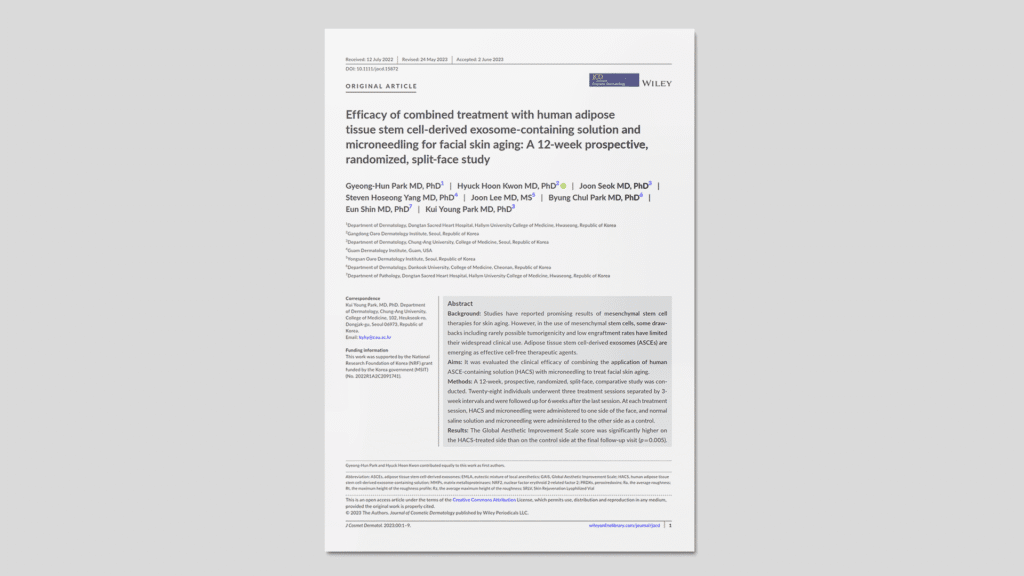 Eficacia del tratamiento combinado con una solución que contiene exosomas derivados de células madre del tejido adiposo humano y microneedling para el envejecimiento cutáneo facial: estudio prospectivo, aleatorizado y dividido por mitades faciales de 12 semanas.