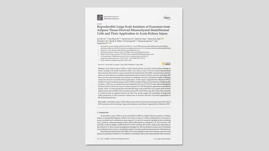 El método TFF permite producir exosomas de alta calidad y reproducibilidad aptos para uso terapéutico. Los ASC-exosomes demostraron capacidad protectora y de rescate en daño renal agudo letal, posicionándose como una plataforma escalable y segura para futuras aplicaciones clínicas en enfermedades renales graves.