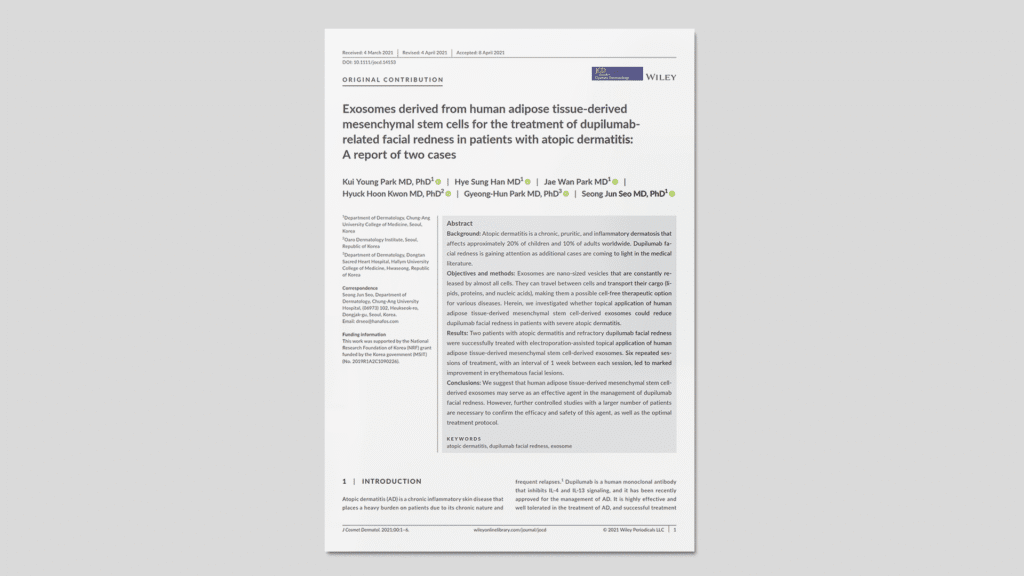 La aplicación tópica asistida por electroporación de exosomas derivados de células madre adiposas podría representar una alternativa terapéutica segura y eficaz para el manejo del enrojecimiento facial inducido por dupilumab en dermatitis atópica, aunque se requiere evidencia clínica ampliada para confirmar su eficacia y definir protocolos óptimos.