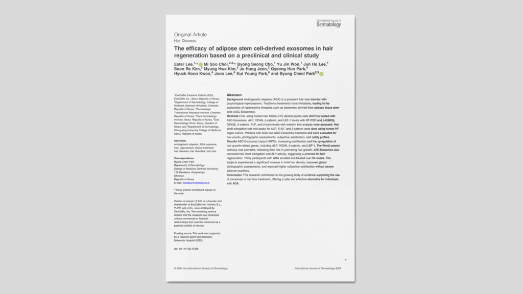 El estudio analizó la proliferación celular, expresión génica y elongación del tallo piloso en cultivos de papila dérmica humana tratados con ASC-Exosomas. Los resultados mostraron aumento en la proliferación de células DPC y en la expresión de genes asociados al crecimiento capilar (ALP, VCAN, β-catenina, LEF-1), junto con activación de la vía Wnt/β-catenina. En el ensayo clínico, 30 pacientes con AGA tratados mediante microneedling y aplicación tópica de ASC-Exosomas mostraron incremento significativo en densidad capilar (de 158 a 166 cabellos/cm² a las 24 semanas), mejora fotográfica global y alta satisfacción subjetiva, sin efectos adversos graves.