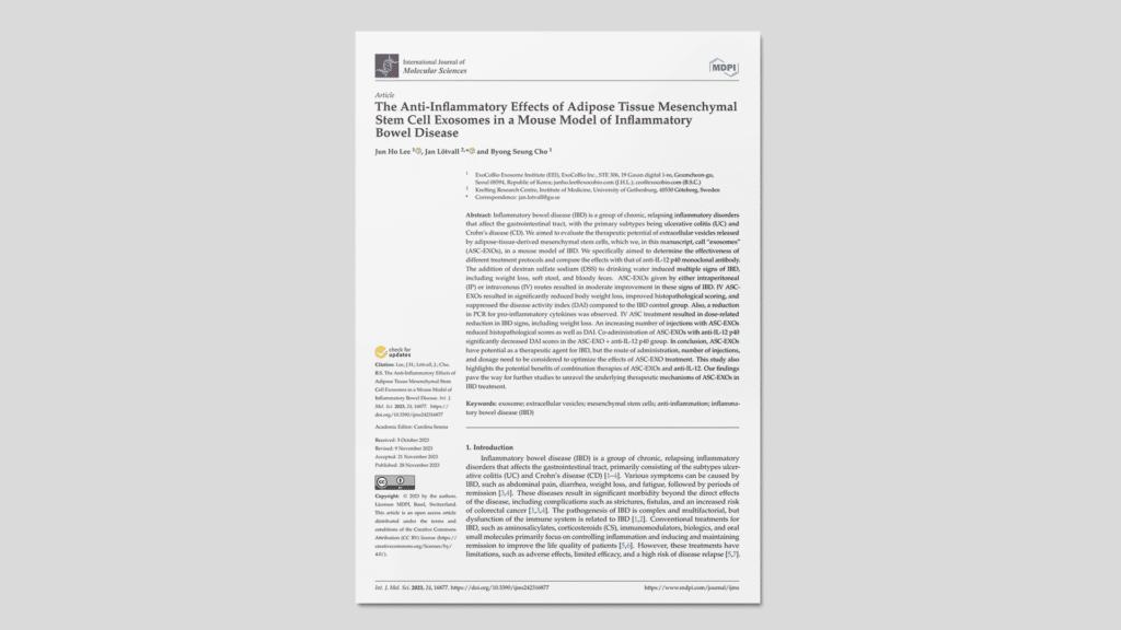 Se desarrolló un modelo de colitis en ratones mediante administración de DSS al agua, y se analizaron distintos protocolos de tratamiento con exosomas de ASC por vía intravenosa o intraperitoneal, variando dosis y frecuencia. Los animales tratados mostraron mejoría en pérdida de peso, puntuación histopatológica e índice de actividad de la enfermedad (DAI), junto con reducción de citocinas proinflamatorias (IL-6, TNF-α, iNOS) y aumento de IL-10. Además, la combinación de ASC-EXOs con anticuerpo anti-IL-12 p40 potenció la respuesta terapéutica y mejoró la supervivencia en modelos agudos y crónicos de colitis.