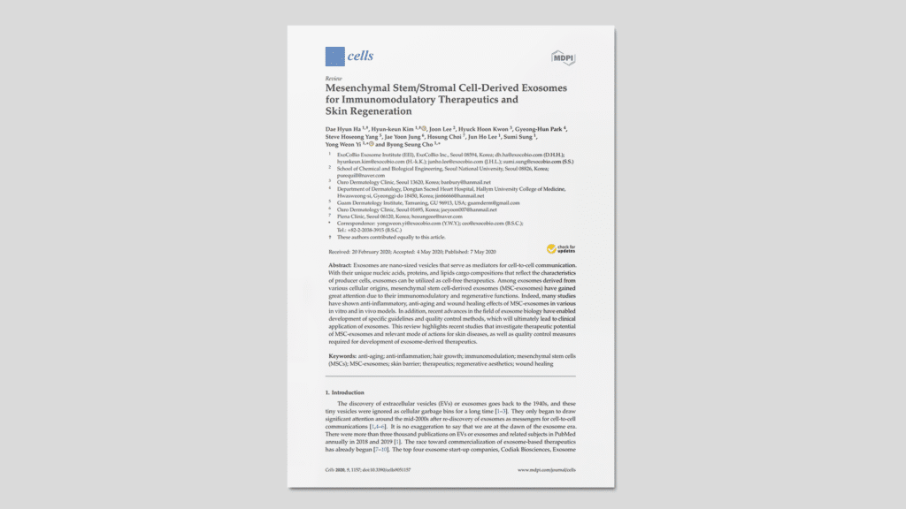 Investigación que describe los mecanismos inmunomoduladores y regenerativos de los exosomas derivados de células madre mesenquimales de tejido adiposo humano (ASC-exosomes) sobre la piel inflamada y dañada.