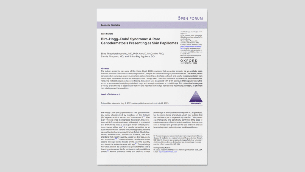 Una paciente de 53 años con lesiones papulosas recurrentes en cara y cuello, previamente tratadas como verrugas o papilomas, fue diagnosticada finalmente con síndrome de BHD tras biopsia y confirmación genética de mutación FLCN (17p11.2). Además, presentaba antecedentes de neumotórax espontáneo y quistes renales y pulmonares. Se implementó un tratamiento estético combinando microneedling y aplicación tópica de exosomas (Exocode Radiance, ExoCoBio) en tres sesiones mensuales. La paciente mostró mejora visible en la textura, pigmentación y reducción de las lesiones cutáneas, con buena tolerancia y sin eventos adversos. Se discuten las posibles implicancias del tratamiento exosomal en la vía mTOR/AMPK, alterada en el BHD.