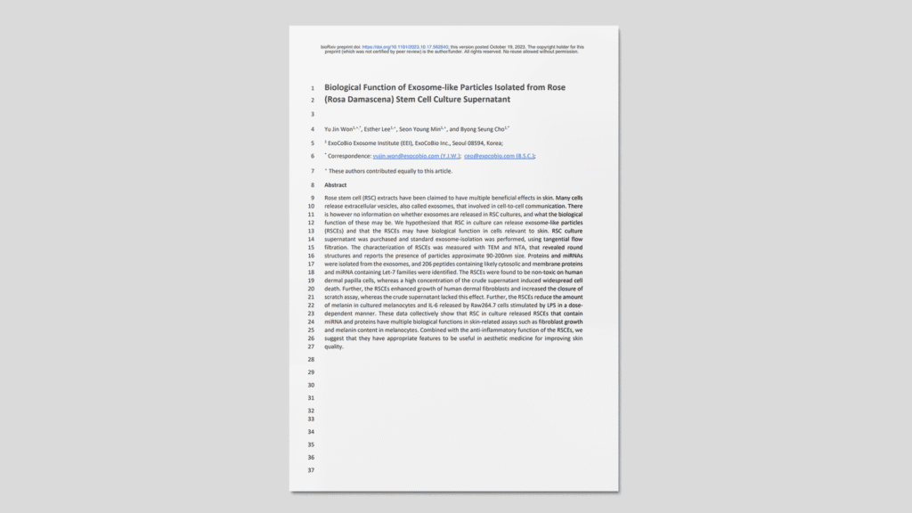 Primer estudio que identifica y caracteriza vesículas extracelulares similares a exosomas derivadas de cultivos de células madre de rosa (RSCEs), evaluando su composición y funciones biológicas sobre células humanas relevantes para la piel.