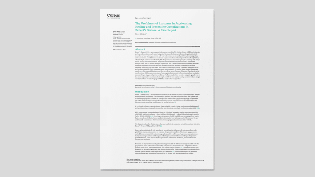 Una mujer de 38 años con enfermedad de Behçet, antecedentes de cicatrización retardada y formación de queloides tras abdominoplastia, se sometió a reducción de labios mayores y exéresis de quistes vaginales y de Bartolino. Previamente se optimizaron los marcadores inflamatorios (PCR y VSG) mediante ajuste de colchicina. Durante y después de la cirugía se aplicaron exosomas de células madre de rosa tópicamente en dos capas, repitiéndose a la primera y cuarta semana postoperatoria. El proceso de cicatrización fue completo en seis semanas, sin dehiscencias, infecciones ni queloides, y con excelente resultado estético y funcional.