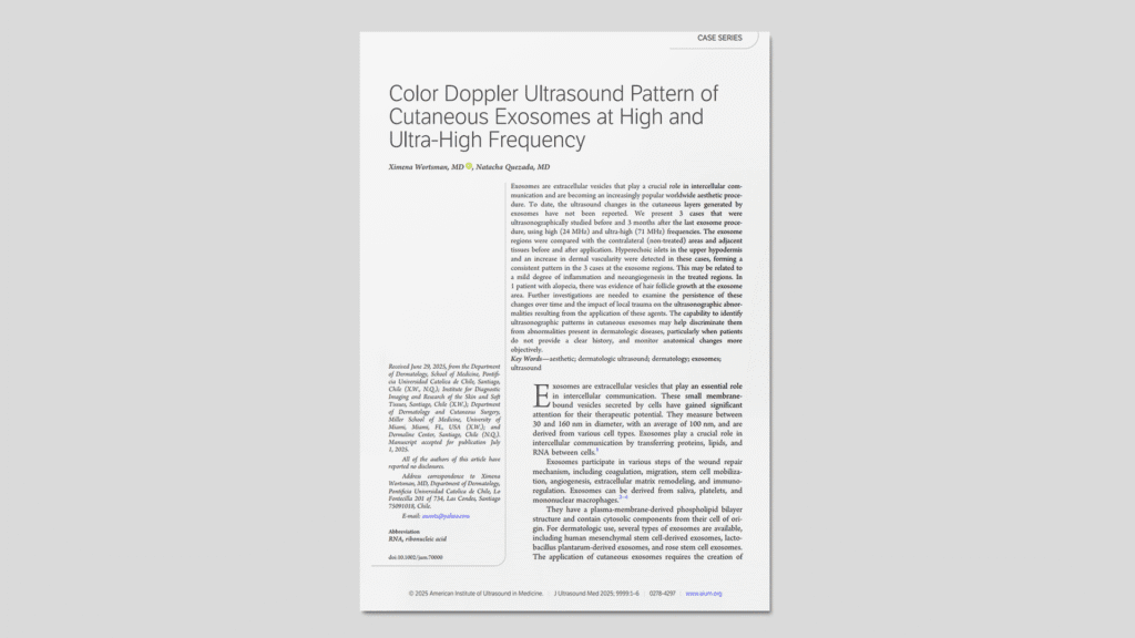 Serie de tres casos que describe por primera vez los hallazgos ecográficos cutáneos posteriores a la aplicación de exosomas, utilizando ultrasonido Doppler color en altas y ultra-altas frecuencias.