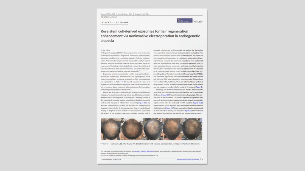 Reporte clínico que describe la mejora en densidad, grosor y crecimiento capilar en un paciente con alopecia androgenética tratado con exosomas derivados de células madre de rosa (RSCEs) administrados mediante electroporación no invasiva.